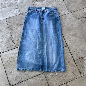 Stylish denim maxi skirt. Classic blue wash. Perfect for casual wear.