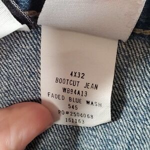 Features : boot cut silhouette, faded blue wash, medium blue, whiskering, 5-pocket styling, zip fly, button closure, belt loops, classic denim, slight stretch, bootcut jeans