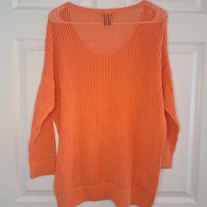 Excellent condition, lightweight coverup/sweater from Calvin Klein Jeans. Open knit fabric is very soft and stretchy. Salmon/coral in color - more on the orange side than pink. Oversized fit. Size Large; measures about 26 inches between the pits, 26 inches long and 16 inch sleeves (from shoulder seam).
