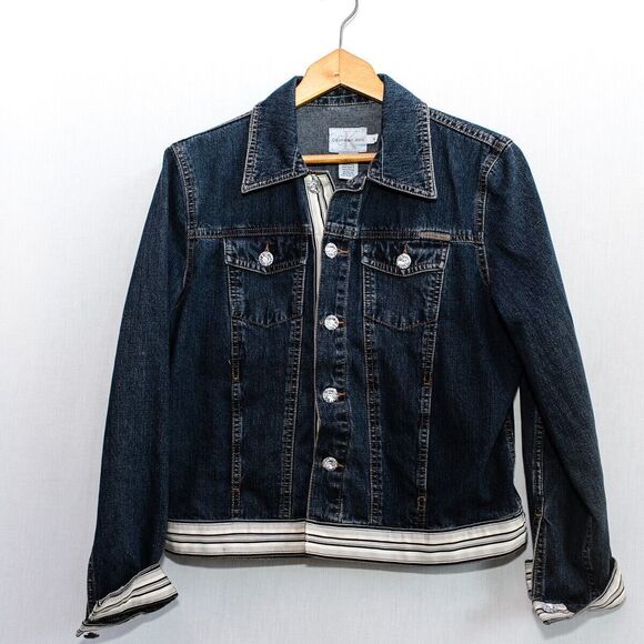 Calvin Klein Jeans Denim Jacket M hand decorated with striped fabric trim EUC, buttons were changed I believe and second button on adjustable tabs were removed on the bottom, some small stains on the added trim