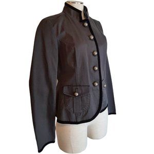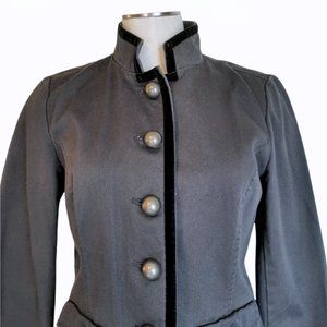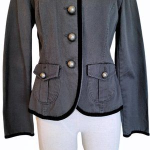 Calvin Klein Jeans Gray Cotton & Velvet Military Style Jacket. Cute blue gray cotton jacket with velvet trim, oversized antiqued silver buttons, rounded hem. Fitted silhouette. Very good preowned condition.