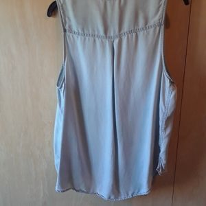 Stylish light blue tank top. Features buttoned front and dual chest pockets. Sleeveless design for comfort.