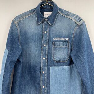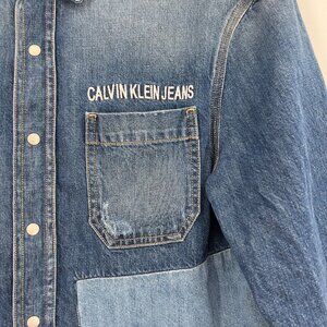 Stylish Calvin Klein Jeans long-sleeve denim shirt featuring a unique patchwork design in varying blue washes. Button front closure with white snaps, button cuffs, and a single chest pocket embroidered with “Calvin Klein Jeans.” 100% cotton for a comfortable and durable wear.Brand: Calvin Klein Jeans