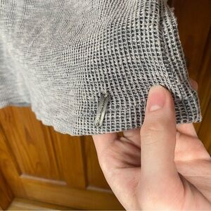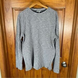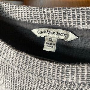 Sweatshirt by Calvin Klein Jean in brand new condition, absolutely no pulls. Features a dark grey base and interior with a lighter grey mesh design knit overlay. Finished with the signature logo embellishment on the lower left front.
