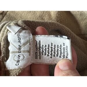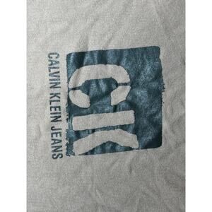 This Calvin Klein Jeans men’s sleeveless 1/4 zip vest in size large is made from 100% cotton and features a casual, relaxed fit. The front includes a functional quarter-zip neckline and a roomy kangaroo pocket, giving it a sporty and comfortable look. The back showcases a bold CK Calvin Klein Jeans logo graphic in a distressed teal print. The soft, washed cotton fabric adds a vintage-inspired feel, making it perfect for layering or wearing on its own for an easy casual outfit.