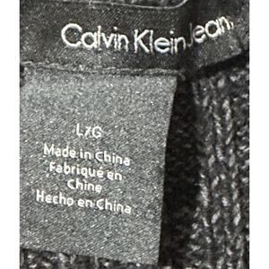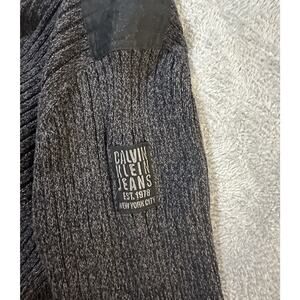 Calvin Klein Jeans men’s full zip ribbed sweater in charcoal gray, size Large. Features a mock neck zip closure, military-style shoulder patches, and Calvin Klein Jeans logo patch detail on sleeve. Made of 100% cotton, comfortable and warm for layering.
