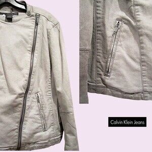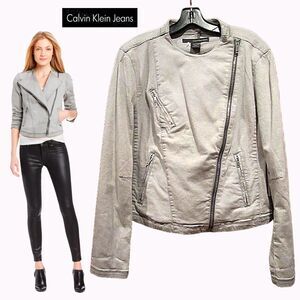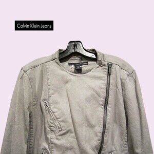Calvin Klein Jeans NEW Moto Asymmetrical Zip Crop Denim Jacket L. A neutral color denim styling gives this moto jacket from Calvin Klein Jeans an edgy look that complements your casual look. Chic and stylish! See pics for details and the measurements provided below/Table Chart in the pics to size this jacket.