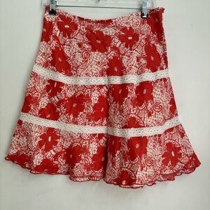 Chic mini skirt with bold red floral pattern. Features delicate lace accents. Perfect for a stylish look.