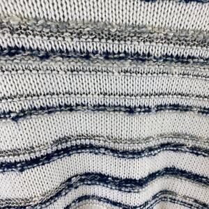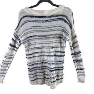 Excellent preowned condition. Round neck long sleeve striped chunky knit sweater. Is a little oversized in the body of the sweater for a small, but sleeves are very fitted. Approx. measurements: Shoulder to hem 25", pit to pit 22", sleeve from neck to sleeve hem 32". Size S.