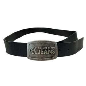 Calvin Klein Jeans Unisex Belt Black Leather w/ Large Metal Buckle Spellout Sz L. Preowned. Excellent condition. Comes from smoke free home. Ships out fast!