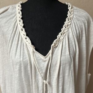Elegant white tank top with braided neckline. Sleeveless design. Perfect for casual wear.