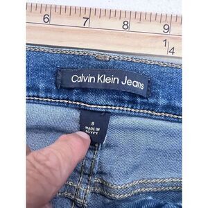 Elevate your style with these Calvin Klein Jeans in a women's size 8. These high-rise skinny jeans feature a repreve material and dark wash blue color that is perfect for any occasion. The cotton blend material and stretchy fabric type make them comfortable to wear all day long. The jeans have a solid pattern, zipper closure, button, and logo accents that add a touch of sophistication to your outfit.