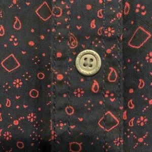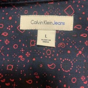 Calvin Klein Jeans cotton short sleeved button down shirt, size L..slightly used, in great condition..red/navy pattern..