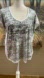This is a Calvin Klein t shirt blouse white on back is a pretty sheer silky fabric, the front is a thin grayish w silver metallic Tshirt material. Hard to see the shiny silver color. Short sleeves sz MD, true to fit, on the loose side, stretchy.