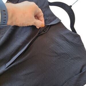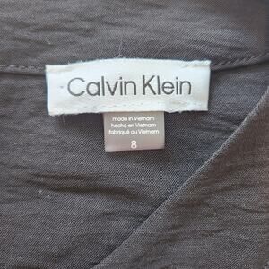 This Calvin Klein jumpsuit is in terrific pre-owned condition. It has a wide elastic waist with a tie in front. There are hidden buttons down the back. The pants are wide leg and have side pockets plus back pockets. The only flaw is a section of loose thread at the bottom of one leg, shown in photo. See photos for measurements, fabric content, and care. Size 8