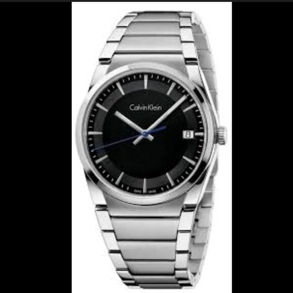 The Calvin Klein K6K31143 is a men's "Step" collection watch featuring a sleek silver stainless steel case and bracelet, a black dial with date function, mineral crystal, and Swiss quartz movement, offering a modern, minimalist style with 30m water resistance for everyday wear.