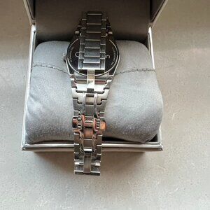 This watch is known for its clean design, with a black dial and a contrasting blue second hand on some models, set in a durable stainless steel body, making it a versatile accessory.