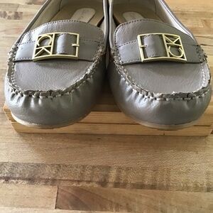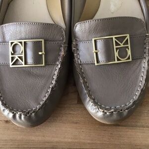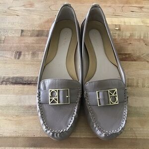 Easy neutral addition to your closet. Goes with anything. The CK gold toned buckle adds a little bling.