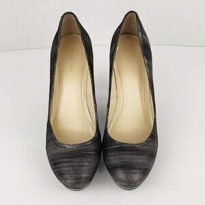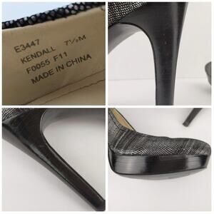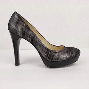 Calvin Klein silver & black platform pumps. Size 7.5M with a 4.5" heel and a .75" platform. Some mild scuffs on the heel and platform, not noticeable unless you're looking up close. There's also a small crack on the inner lining of the right shoe. It's not visible while wearing them. Imperfections are shown in photos. Please look closely.