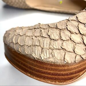 Good-fair used condition: some areas of the fish skin texture are “roughened” up, and there are a few scuffs, although I think they are pretty well hidden with the overall texture. Minor sole wear. See pictures.