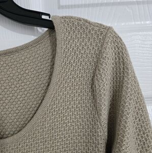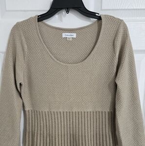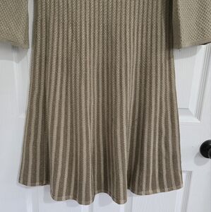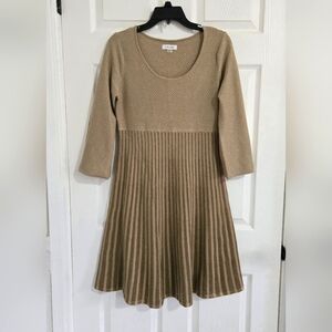 This is a Calvin Klein loose knitted a line dress. Womens/juniors size medium. It has a tannish/green color with gold metallic accents knitted throughout. Has 3/4 sleeves with a form-fitting top and a loose fitting flowy bottom. It sits right about knee length depending on your height. It's only been worn a couple times and is still in excellent condition, no holes or stains. Perfect for semi-casual, business casual, festival, party, prom, homecoming, special occasion, graduation, quiet luxury, bohemian, etc.