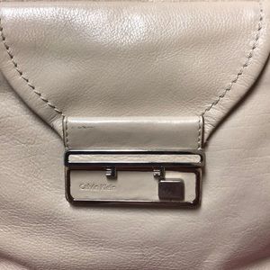 Calvin Klein Large Satchel In cream all genuine leather with top zipper closure with logo pull tag. Full pocket compartment at back and spacious front pocket in front with flap closure and bonus side pockets. Gray lining. Minor dirt stains, bottom leather fray and some pen marks on inside lining. Great for traveling. Very Spacious! 17”x10.5”x5.5”