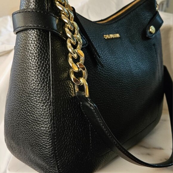 Calvin Klein Leather Pebbled Leather Bag with Gold Chain and Flat Black Leather