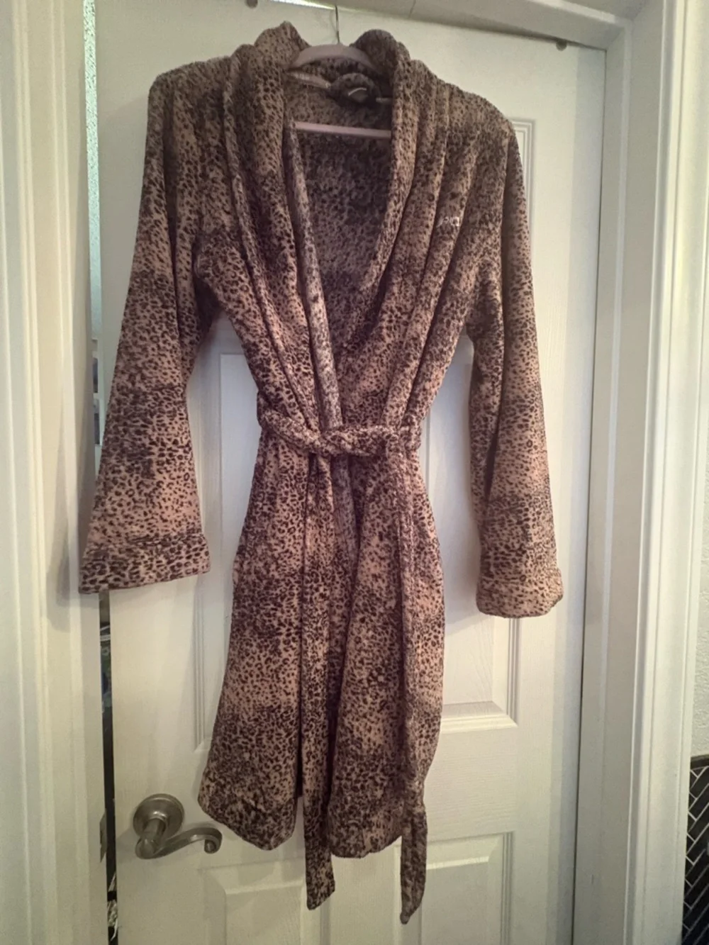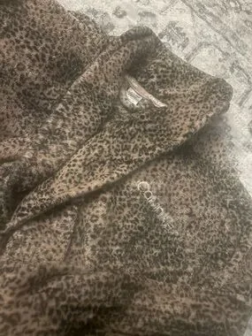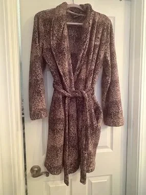 Plush leopard-print robe by Calvin Klein. Soft, cozy fabric with shawl collar. Wrap style with self-tie belt and inner belt. Long sleeves for full coverage. Size M/L