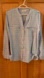 Size medium and measures 28 shoulder to hem and 22 pit to pit. The blouse buttons up and sleeves can be worn or buttoned up. Two front pockets with zippers. Blouse can also be buttoned up with a strap on the hem for style. There is a spot in the blouse that is photographed.