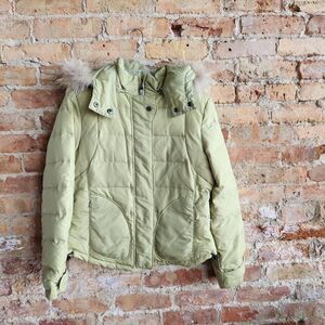 hood is removable! this coat could use a quick wash, there are some light spots but nothing that would stop me from wearing it, just worth noting. Tons of life left
