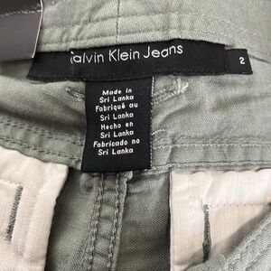 Calvin Klein Linen Blend Cargo Shorts Women's 2 Green Button Pockets Inseam 5", new with tags, removable hang tag has spot (will not affect wear) zip closure, woven fabric 54 linen, viscose