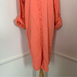 Calvin Klein Linen Blend Shirt Dress. Women’s size 10. Orange/sherbert/coral. Roll Tab long sleeves. Faux pockets on chest. Button front the whole length. Preowned condition. One very tiny mark on front, really faint, see pic. Free of holes. Color is very pretty in person.
