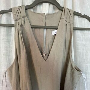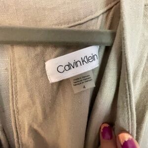 Gorgeous Calvin Klein wide leg linen jumper. Never worn. Very flattering and feminine with Zipper down the back with a three button closure. Ties at the waist with two deep hand pockets. Fabric is a linen viscose blend.