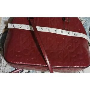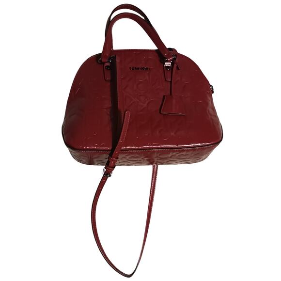 Calvin Klein Logo Red Vegan CK Embossed Handbag Purse with Shoulder Strap EUC. Very clean. Inside side zipper pocket has a flaw the liner is sewn wrong. Everything else is in mint condition!