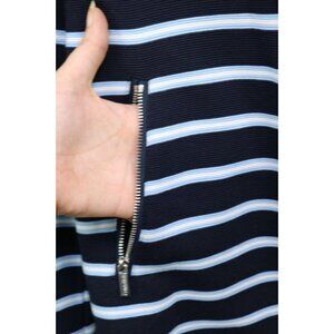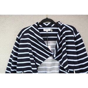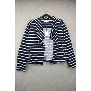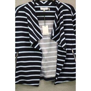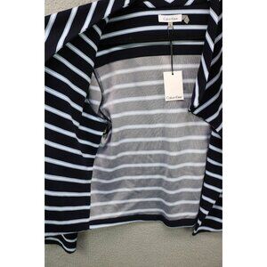 This is a Calvin Klein Long Sleeve Blue and White Striped Open Front Cardigan that is a size Large. It is a thick nice material. It is 80% Polyester, 19% Rayon, and 1% Spandex. Laying flat, it measures: Armpit to armpit-23" and the length is 21.5". It is new with tags and retails for $109.50. It is really nice.