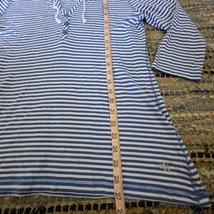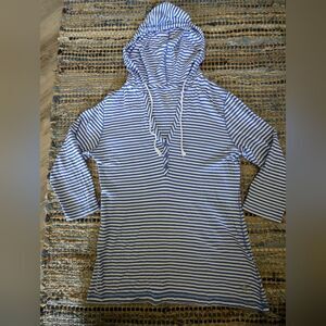 Calvin Klein M Blue White Striped Henley Hoodie Sweatshirt Shirt Tunic 3/4 Sleeve Coastal Grandma Tagless Beachy Boho Casual Summer Spring Fall Cotton Modal Blend Stretch Pullover Vneck Soft Lightweight Logo Buttons Drawstring Preppy Twee Weekend Nautical Ocean Swim Cover Up Sheer See Through