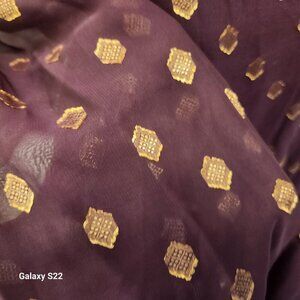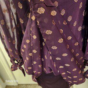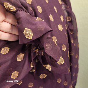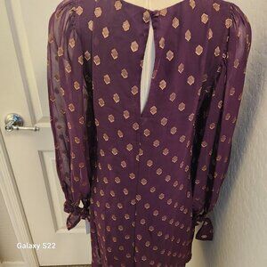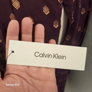 Calvin Klein Maroon and Gold Baby doll dress. NWT. Size 12. No rips/stains/tears/pulls. All intact. Tie wrists. Cutout on the back with button closure. Over the head. No zips. Arms are sheer, has a under layer with 2 plus inches of sheer on the bottom, just love that! Material: 100% Polyester. Soft and flowy. Extra button on interior. Measurements: Pit to Pit: 19 inches. Shoulder tot bottom: 37 inches. Smoke free home. No odors. All offers are welcome. Thank you!