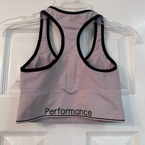 Elegant blush sports bra with striking black trim. Ideal for active wear.