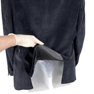 This blazer tells a tale of timeless elegance, crafted by Calvin Klein for the modern gentleman. The soft black corduroy fabric and classic two-button design exude sophistication, while the silky lining whispers comfort and refinement. A versatile companion, it complements both casual and formal ensembles effortlessly.