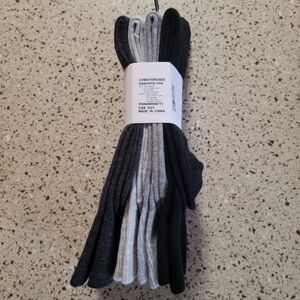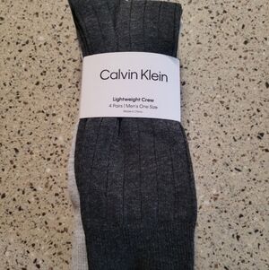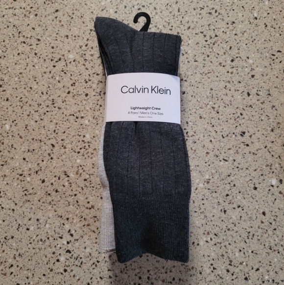 NEW With Tags Calvin Klein Mens 4 Pairs Ribbed Lightweight Crew Trouser Dress Socks OSFM. 3 light, medium, dark gray and 1 black pair.