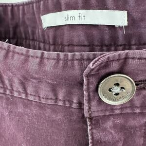 Calvin Klein men’s slim fit pants in a rich burgundy purple shade. Made from a cotton stretch twill blend for comfort and flexibility. Features 5-pocket styling, zip fly with button closure, and Calvin Klein hardware detail.