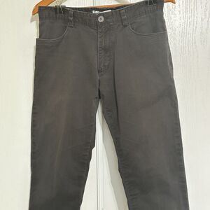 In used condition with no noted flaws. The pants look black or dark brown, not sure. Size Tag shows size 32x30 but they show signs of alterations. Please view pictures for reference to true approximate measurements and condition.