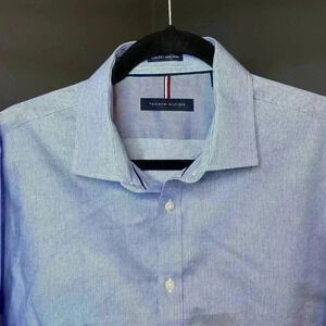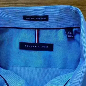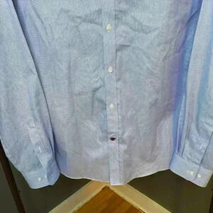 This Calvin Klein men's dress shirt is in like new condition. Light Blue and white pinstripes add a touch of sophistication and class to this top. Whether you wear this to a special occasion, date night or even to work you are sure to show up in style.