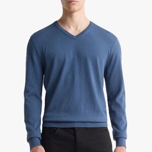 Calvin Klein Men's Extra Fine Merino Wool Blend V-neck Sweater Blue Stay stylish and comfortable with this Calvin Klein men's blue sweater. Perfect for any occasion, this sweater offers a classic look with a modern twist. v neck . the model is wearing the same sweater in a different shade of blue