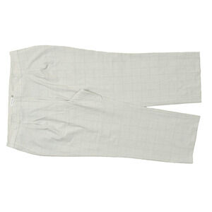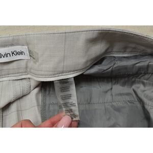 These men's trousers from Calvin Klein are in excellent used condition. Crafted with a blend of 71% polyester, 22% rayon, and 7% spandex, they offer both style and comfort. The gray plaid pattern provides a classic, versatile look. They feature a flat-front design with a zip fly and hook-and-eye closure. The pants have a waist size of approximately 34 inches and an inseam of approximately 27 inches. These trousers are perfect for a variety of occasions, from business casual to everyday wear, and offer a comfortable and flexible fit. All measurements are approximate. See all photos for a detailed look at the item's condition and features.