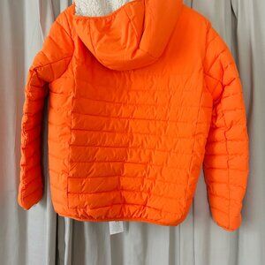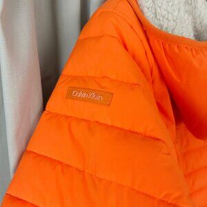 Introducing a stylish and functional puffer jacket from the renowned brand Calvin Klein. This unisex jacket is made of softshell nylon and is available in an eye-catching orange color. It features a full zip closure and pockets for convenience.