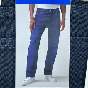 Classic dark wash. Straight fit sits below waist with easy fit through hip and thigh. High stretch for comfort and flexibility. Tag shows W36 x L34.
