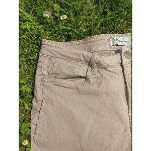 The product is a pair of Calvin Klein Men's Khaki Flat Front Beige Casual Shorts in size 30. These shorts are perfect for a casual summer look, made of cotton material with a relaxed fit. The solid beige color and zip closure make them a versatile addition to any man's wardrobe. With a chino style and slash pocket design, these shorts are ideal for a day at the beach or out for a leisurely stroll, exuding an American outdoor and preppy vibe.