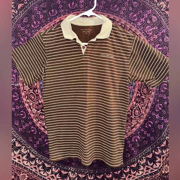 Calvin Klein Men's Polo Shirt in Brown and Cream Stripes