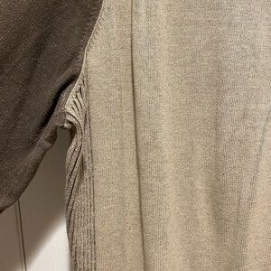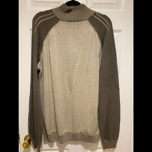 This Calvin Klein pull over sweater cardigan features a quarter-zip front closure and mock neck. This cardigan also features a tan and beige color block design. Size XXL. Dress it up with slacks or dress it down with jeans. In excellent preowned condition.